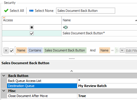 To enable the Back plugin, Sales Document Back Button must be enabled in Modules > Security Editor. Enter specific queues where Back will be accessible (* for all) in the sub-setting Back Queue Access List.
