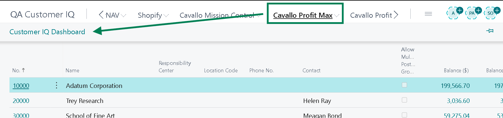 Customer IQ Dashboard - This dashboard can be found under the Cavallo Profit Max navigation option in Business Central
