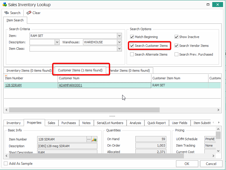 Sales Inventory Lookup (Inventory Lookup screen accessed from a sales document) has a tab where Customer Items can be viewed and selected. A Customer Item, which is set up in Dynamics GP under Customer Item Maintenance, is an alias or alternate item number for a standard inventory item.