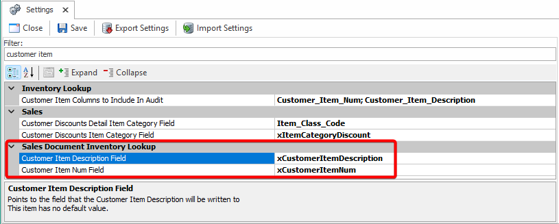 - In the Settings module, specify the name of the new user fields in the Customer Item Description Field setting and the Customer Item Num Field setting