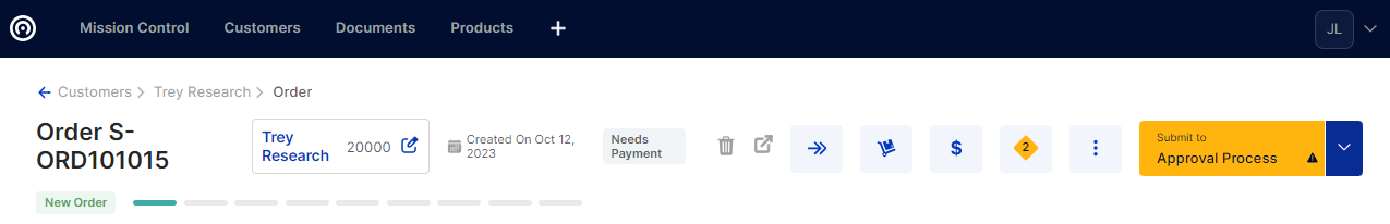 Once business rules have been set up, order entry personnel can submit a document for approval after they have completed all of the order entry details. To do so, the user can simply click the “Submit To” button: