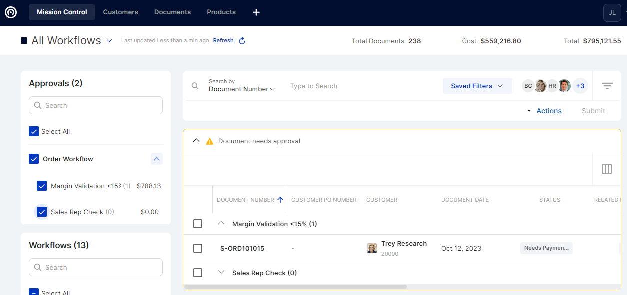 Clicking “Submit for Approval” will move this document out of the normal workflow and into a broken business rule queue. This queue can be seen at the top of the Mission Control dashboard.