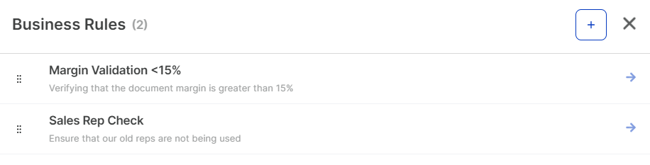 Business rules help ensure that documents are in the correct state before they are transitioned into another queue. In many cases, business rules are used to make sure that a document does not need any corrections or updates. They can also be used to add extra validation around any potential concerns for a given document, such as low margin.