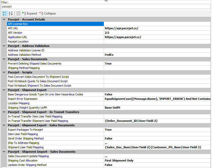 Sales Document Update Mapping – Define the mappings to be used when updating a sales document after a Pacejet shipment has been completed. This setting has no default value.