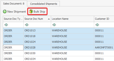 On the Shipment Monitor screen, hold down the CTRL or SHIFT key to select multiple sales documents, then click the Bulk Ship button to process them together.