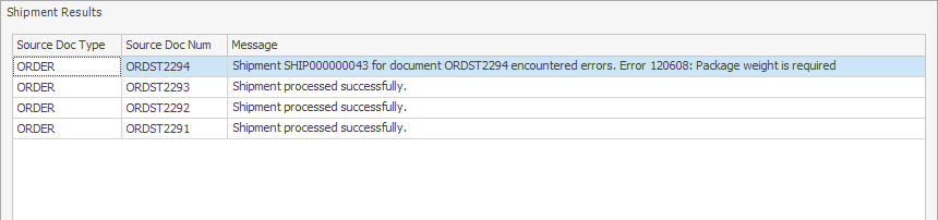 ShipCenter will automatically create and process shipments for the selected sales documents. This operation may take some time to complete. At the end, a window will display the results for each shipment. If any required shipment information was missing or any carrier issues were encountered, this will be displayed so the user can make corrections and try again.