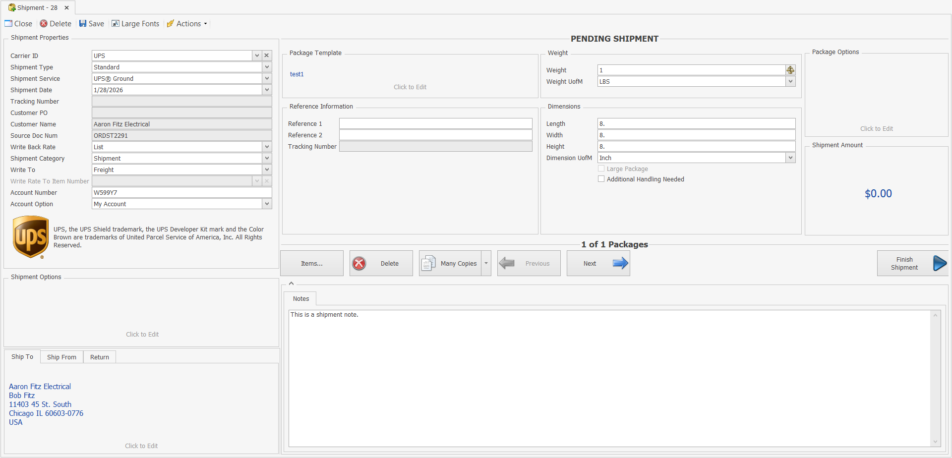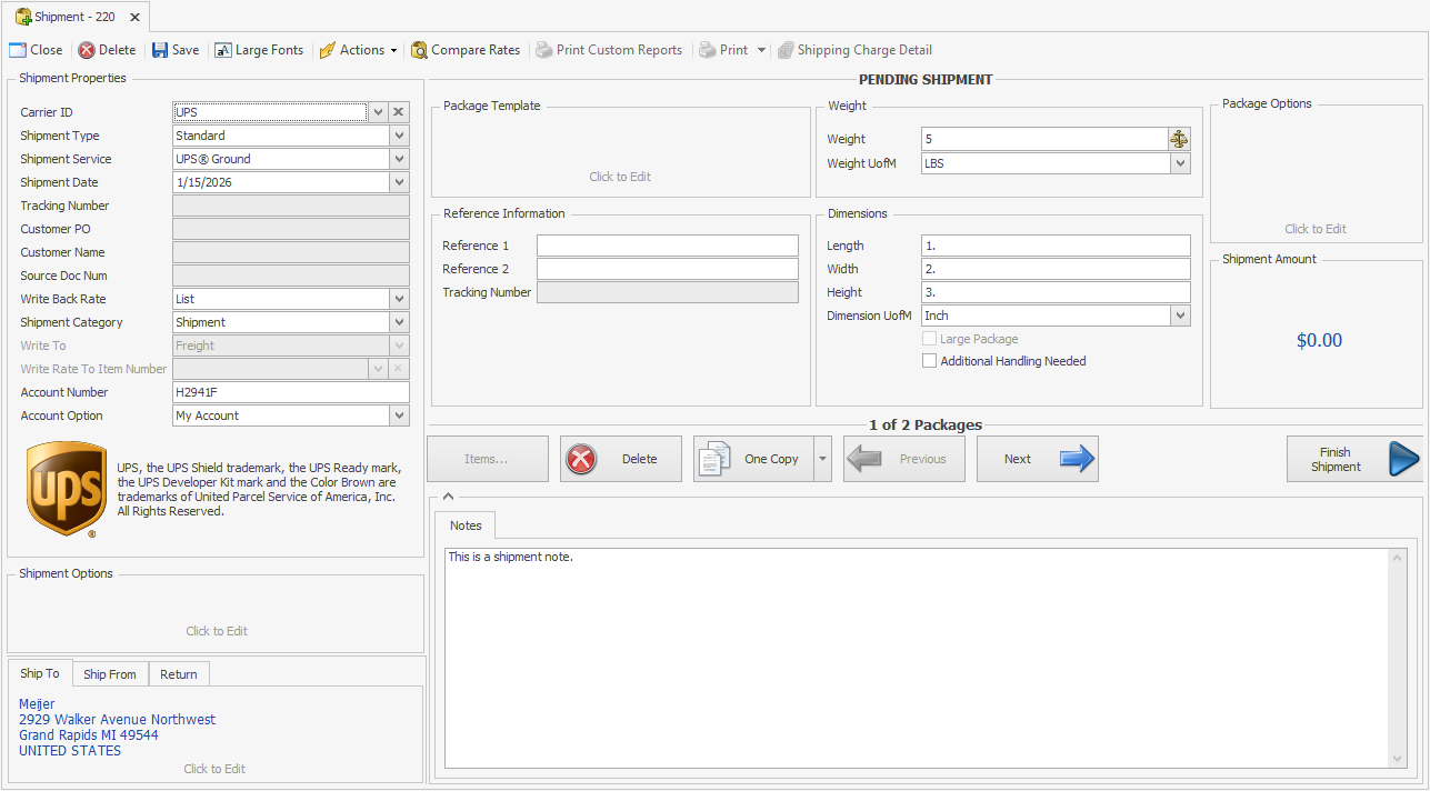 Double-clicking a source document or clicking the New Shipment button will load the Shipment Editor with all of that document’s information, including Ship To Address, default Shipping Method information (if the Shipping Method is set), and line items to be shipped.