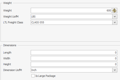 Each shipment line is required to have its weight defined. If a carrier is specified, then either the LTL Freight Class or the Dimensions section needs to be filled out; otherwise, the Dimensions section alone needs to be completed.