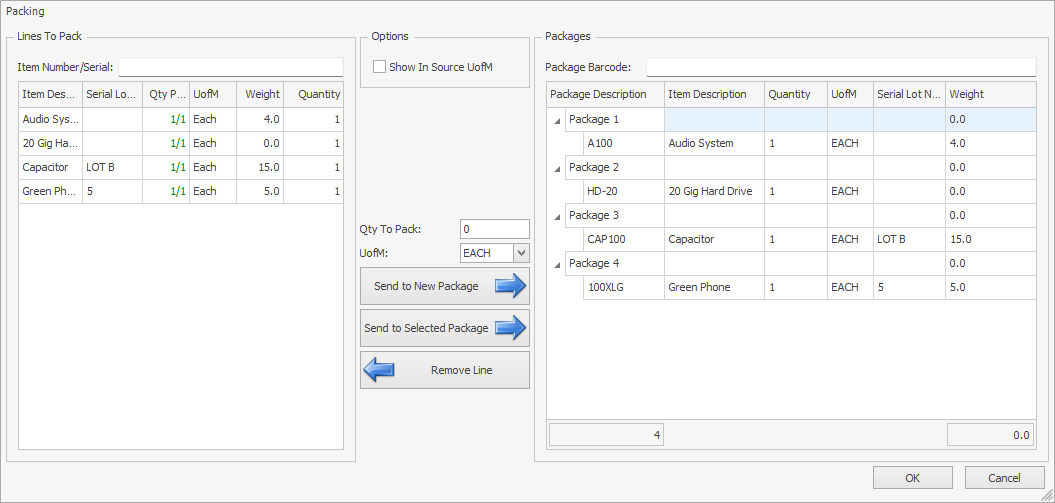 If the Shipment was started from the Shipment Monitor, then clicking the Items button near the bottom of the screen will show the Packing window. This screen allows you to generate packages by dragging lines from the left to the right, or by selecting lines on either side and clicking the button in the center of the window. Clicking OK will update the shipment.