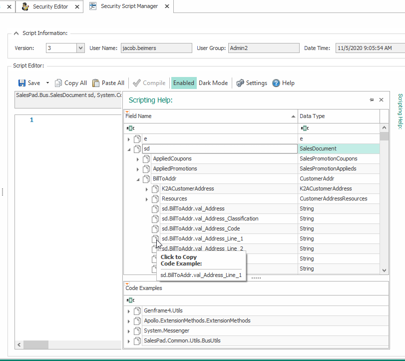 Security Script Manager is a module in SalesPad Desktop that allows users to easily view and modify any C# scripts that pertain to a specific security in security editor. Any scripts from different security groups are viewable and modifiable. In this document you will learn how to read the Security Script Manager Script screen and how to select scripts to modify and view.