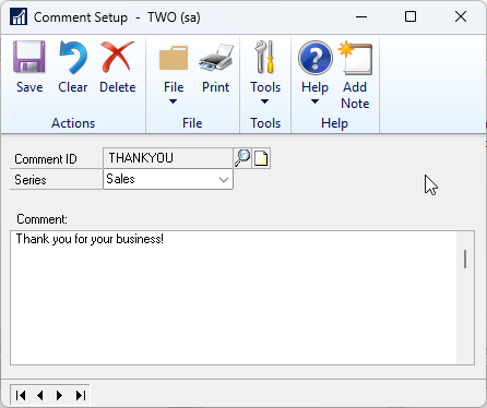 - Go to Microsoft Dynamics GP button > Tools > Setup > Company > Comments. The Comments Setup dialog box appears