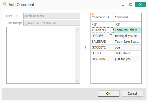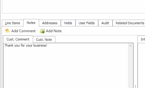 The selected comment will appear in the Cust. Comment column in the Notes tab:
