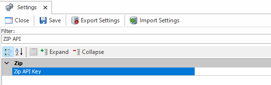 If using the Bing or Google ZIP APIs, an API key will need need to be entered into the Zip API Key setting seen below.